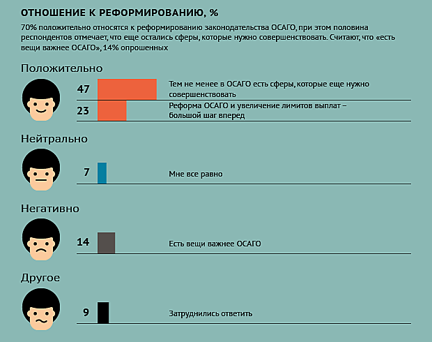 Российские автовладельцы в целом положительно оценили реформу ОСАГО, отмечает компания «Ромир», обобщив данные, полученные в ходе опроса 1500 автовладельцев, проживающих в 35 субъектах РФ в городах с населением свыше 100 тысяч человек. При этом около половины опрошенных считают, что еще очень многое в системе нуждается в улучшении.