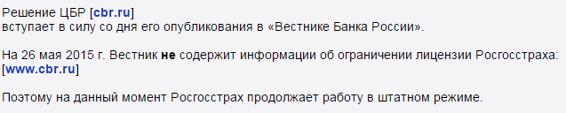 «С начала 2015 года «Росгосстрах» заключил более 5,5 млн договоров, за 2014 год – более 18 млн. При таком количестве клиентов неизбежны недоразумения на местах и соответственно жалобы в ЦБ. Число предписаний, опубликованных пресс-службой ЦБ, полученных «Росгосстрахом» с начала года составляет 385 – это тысячные доли процентов от заключенных за это время компанией договоров по всей стране. Неисполненных предписаний на данный момент не имеем», – говорится в сообщении компании.