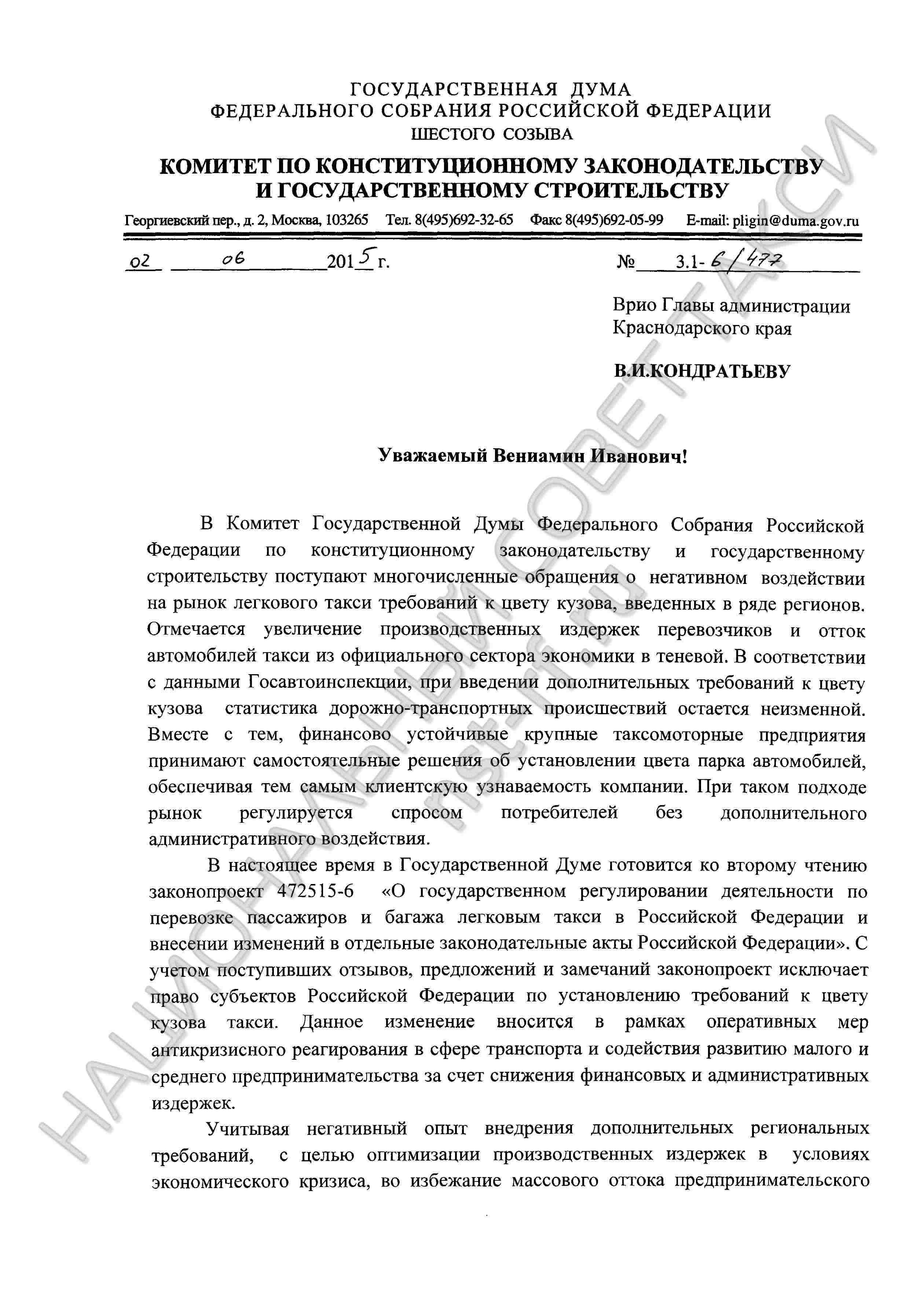 Но председатель-депутат Лысаков склоняет изменить региональные законодательства, чтобы увести отрасль от госрегулирования. Причем, мотивирует сомнительным доводом — неким «рассматриваемым в ГД законопроектом», на основании неких «оперативных мер антикризисного реагирования и мер по поддержке малого и среднего бизнеса», якобы утвержденными правительством РФ. Но в Распоряжении Правительства РФ от 27.01.2015 № 98-р не прослеживается связи между содержащимися в нем мерами с вопросами окраски такси. Прием убеждения, использованный Лысаковым, пожалуй, заслуживает формулировки «вводить в заблуждение глав субъектов РФ».