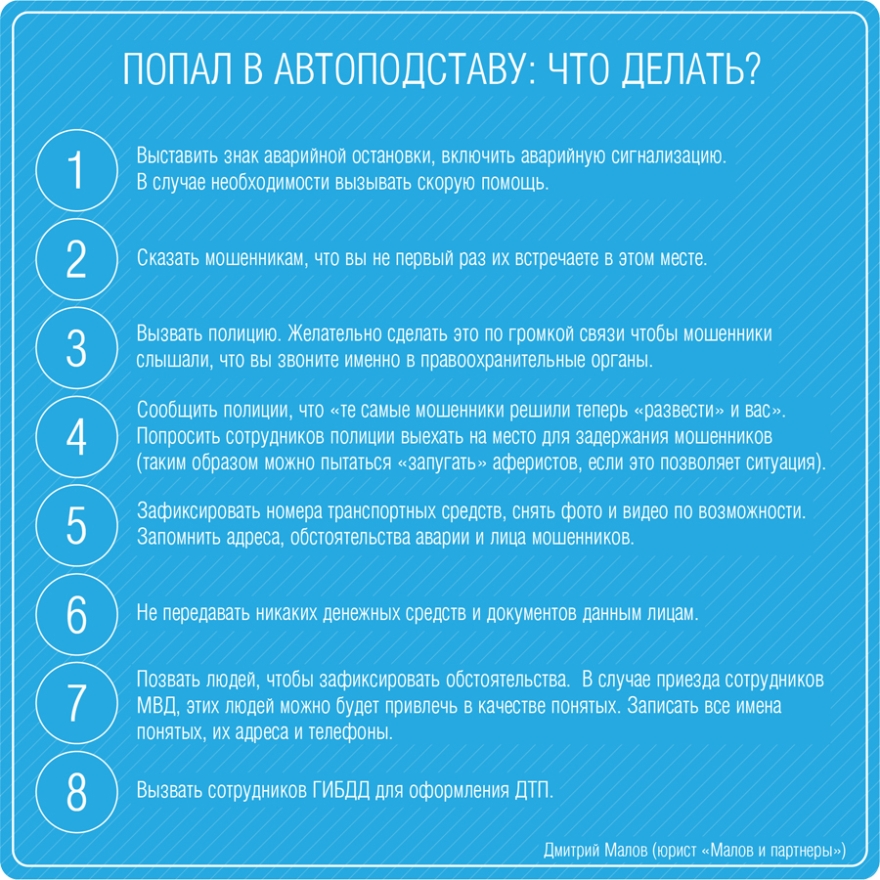 – В случае, если ДТП действительно было, а вы покинули его место, не дождавшись сотрудников ГИБДД и не составив «европротокол», то на лицо состав административного правонарушения (предусмотренного ч. 2 ст. 12.17 КоАП РФ) – в этой ситуации «остаться с правами» маловероятно, – комментирует новый вид автоподставы юрист Дмитрий Малов. – Удастся избежать лишения прав лишь в том случае, если вы докажете, что как такового ДТП не было, а повреждения на машине мошенников возникли ранее.