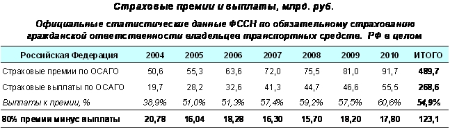 Согласно официальным статистическим данным Федеральной службы страхового надзора, сумма страховой премии, собранной страховыми компаниями по обязательному страхованию гражданской ответственности владельцев транспортных средств за период с 2004 года по 2010 год, в целом по РФ составляет 489,7 млрд. руб., а сумма страховых выплат за тот же период – только 268,6 млрд. руб. (сводную таблицу прилагаем).