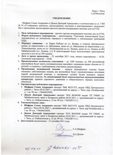В начале недели автомобилисты Читы решили 23 сентября принять участие во всероссийской акции протеста против высоких цен на бензин. По данным организаторов, протестовать в этот день будут 60 городов страны. Позже выяснилось, что власти Читы своё согласие на участие давать не захотели.