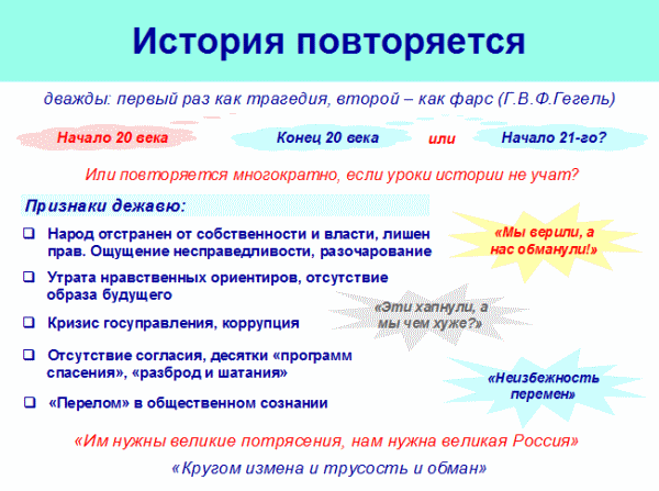 Ситуация в России начала прошлого века привела к трагедии братоубийственной гражданской войны. Горбачевская перестройка завершилась фарсом ГКЧП и распадом Советского Союза. Возможно, однако, что это было только началом фарса или новой трагедии. Нынешняя ситуация в России имеет много общего и с началом 20-го века, и с состоянием умов накануне распада Союза.