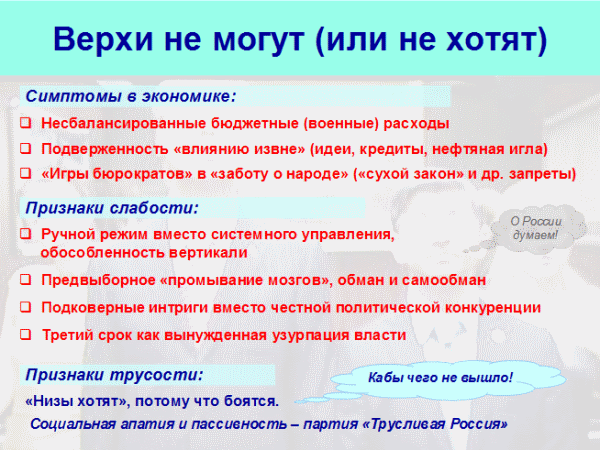 Проявления слабости действующей системы власти: - Переход тендема к ручному управлению – это, фактически, признание неэффективности сложившейся «вертикали власти». Вертикаль превратилась в неуправляемого расчленённого монстра и живет своей обособленной жизнью, проедая все доступные финансовые ресурсы.