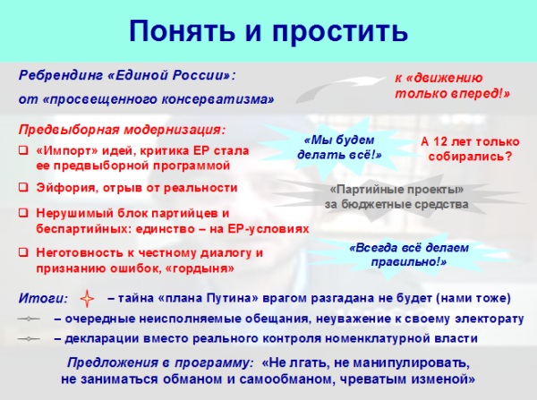 - Видимо, собственных идей молодым технократам всё-таки не хватило, и пришлось в предвыборную программу обновленной ЕР идеи импортировать извне. Разносторонняя критика, которая обильно лилась на ЕР длительное время, органично влита в её предвыборную программу. Кое-что попало и из собранных с миру по нитке предложений объединеного «народного фронта».