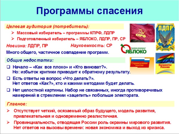 Подготовленный потребитель не нуждается в подробном изложении понятных для него истин. Ему нужно по пунктам оценить программу и принять решение «моё – не моё», «поддерживаю – не поддерживаю». Этим характеристикам в наибольшей степени отвечает программа партии «Яблоко», а также программы ЛДПР и партии «Патриоты России».
