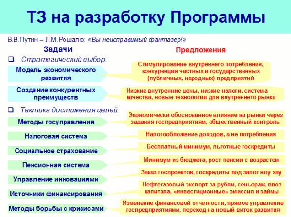 Основной, но не исчерпывающий перечень задач такой разработки включает: с одной стороны, стратегический выбор модели развития и создание конкурентных преимуществ российской экономики, с другой стороны, тактику реализации стратегического выбора на практике. То есть как, каким образом будут достигаться цели развития по всем направлениям государственной политики.