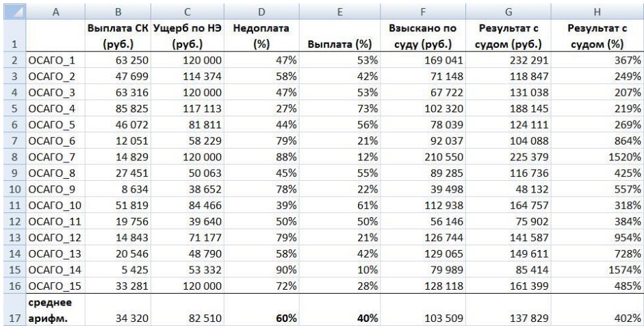 Страховые компании изначально начисляли потерпевшим в среднем лишь 40% от реального ущерба. Средняя недоплата — 48 190 руб. В конечном же счете сраховщики вынуждены были отдать суммы в среднем в четыре раза большие (за счет начисленной неустойки, возмещения расходов на независимую экспертизу, штрафа в размере 50% от суммы реального ущерба, компенсации морального вреда, гонорар юристов). Ни в одном случае страховщики не сумели оспорить данные независимых экспертиз.